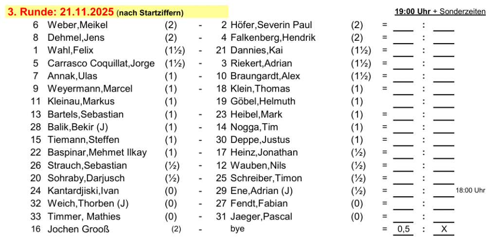 Die Auslosung zur dritten Runde der Vereinsmeisterschaft ist an alle Teilnehmer verschickt. Bitte meldet Euch, falls eine Mail nicht ankommt. Die Verwaltung von E-Mail Listen ist erstaunlich fehleranfällig.