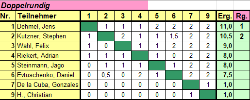 Am Freitag um 19:30 fand das monatliche Blitzturnier statt. Mit einem halben Punkt vorsprung gewinnt Klaus Rybarczyk vor den beiden Verfolgern Jens Dehmel und Severin-Paul Höfer.