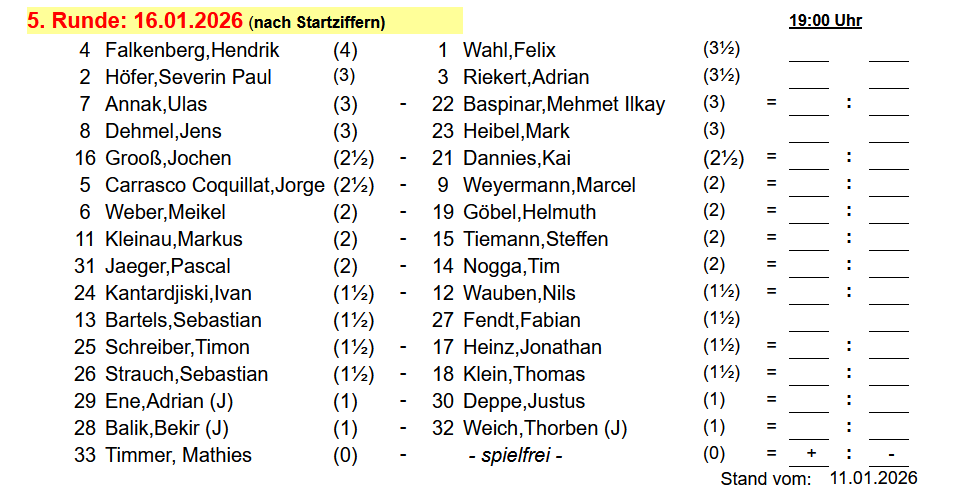 Alle Partien und Nachholpartien bis zur dritten Runde sind gespielt. Die Auslosung ist bereits an alle Teilnehmer verschickt. Alle Details finden sich immer auf unserer Seite zur Vereinsmeisterschaft.