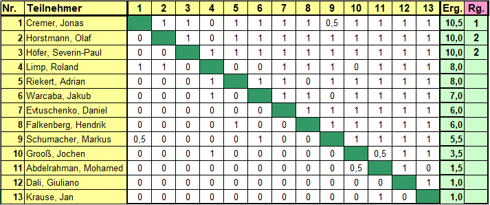 Am Freitag konnte sich Jonas Cremer durchsetzen und das Monatsblitz gewinnen. Es waren auch einige neue Spieler dabei, die sich mutig in den Kampf gestürzt haben.