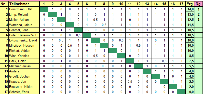 Gestern hat Olaf Horstmann mit 14 Punkten aus 16 Partien das stark besetzte Monatsblitz gewonnen. Herzlichen Glückwunsch!