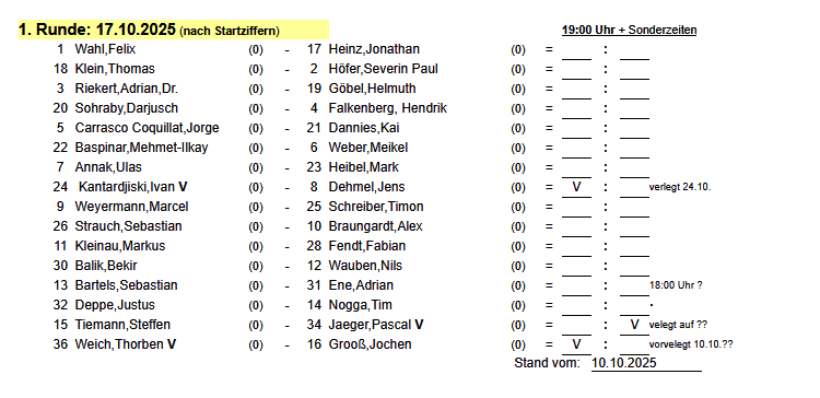 Die erste Runde der Vereinsmeisterschaft ist ausgelost und die Paarungen stehen fest.