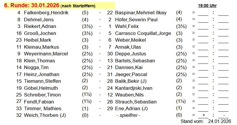 Die Paarungen zur 6. Runde der Vereinsmeisterschaft stehen fest. Alle Teilnehmer haben auch eine entsprechende E-Mail erhalten.